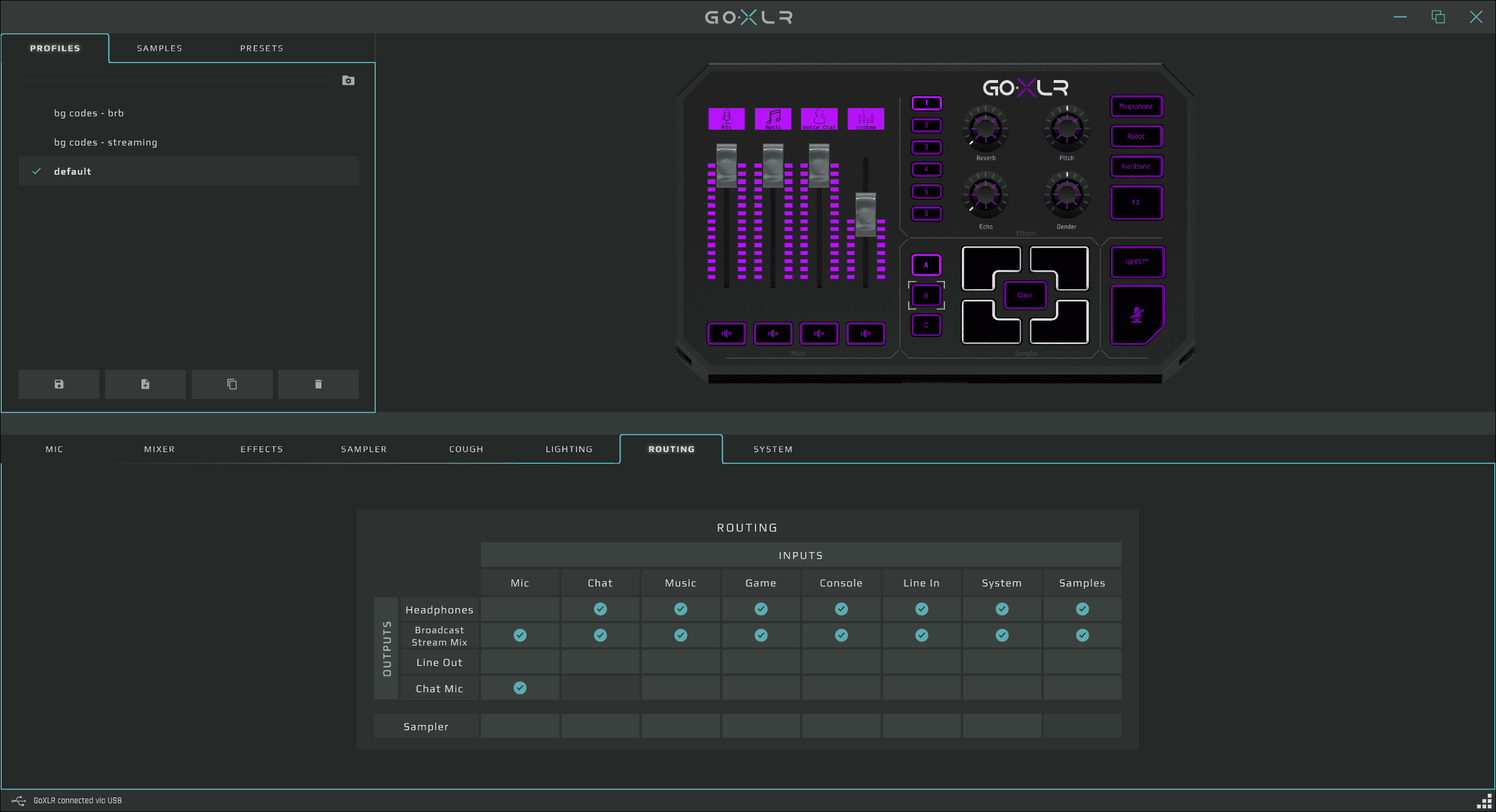 This is amazing because now you can assign the different outputs to the GoXLR faders, and use the routing table to determine which inputs go to which outputs. And that's just the beginning, you can customize literally everything on this machine, like the LEDs, faders, mute buttons, and cough button. It even supports multiple banks of samples and voicemods.